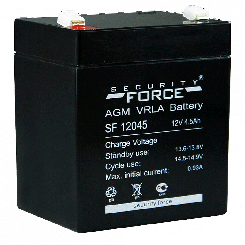 Аккумулятор SF 12045, Security Force, стационарный свинцово-кислотный, Емкость аккумулятора: 4,5 Ач, Номинальное напряжение: 12 В, Хранение: -20...+50°C, Заряд: -10...+50°C, Разряд: -15...+50°C, Размеры: 90х70х107 мм