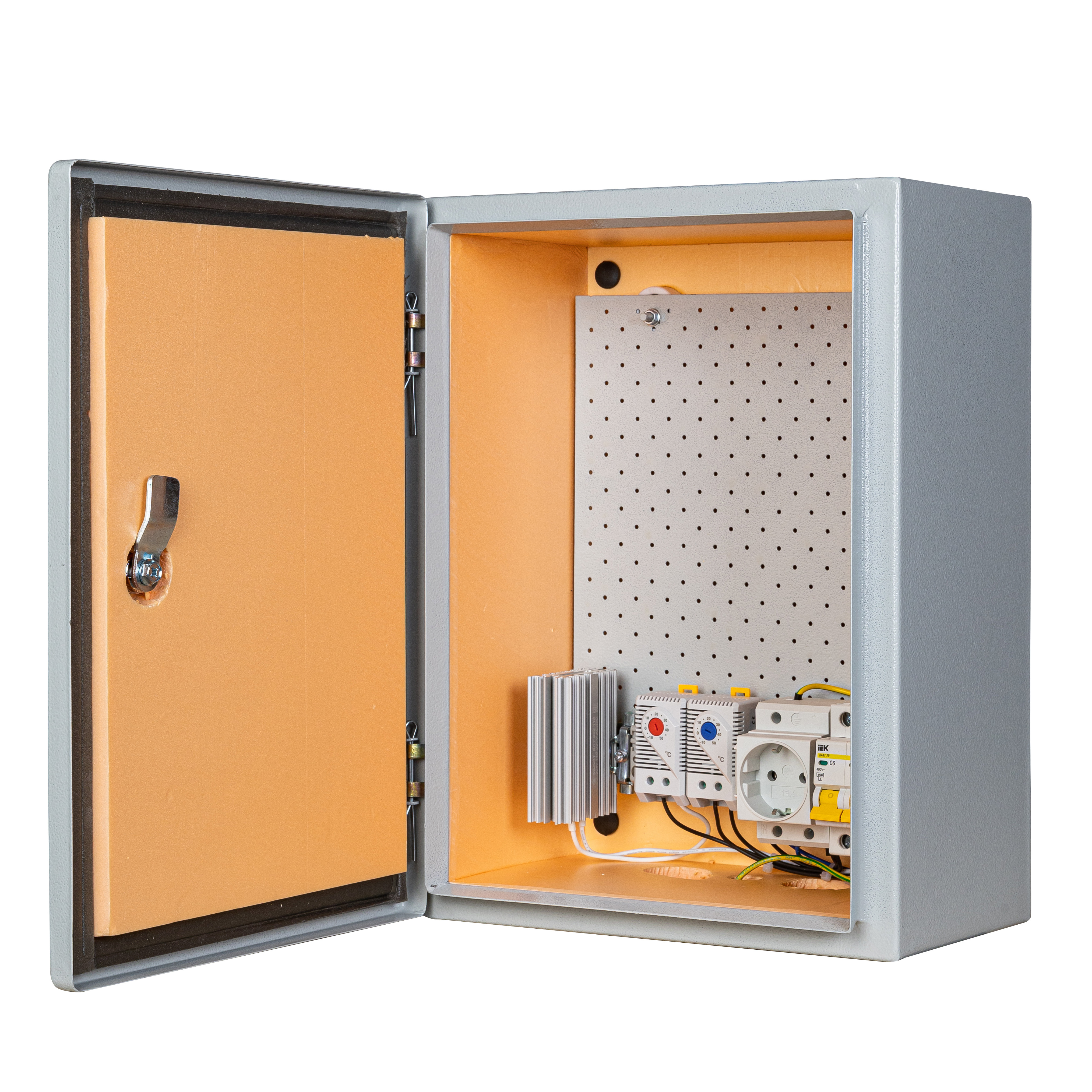 утеплитель из пенополистирола, замок 1 шт,ключ 1 шт, монтажная плата 1шт, гермовводы 2шт, розетка 1 шт, автоматический выключатель 1шт, термореле 1шт., реле предстарта 1 шт., нагреватель мощностью в 30 Вт 1шт.