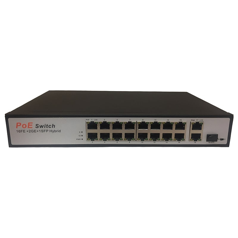 Hunter HN-POE2116 – неуправляемый коммутатор на 19 портов, 16 из которых с поддержкой технологии POE стандарта 802.3af/at (Type A) 100 Мбит. Максимально поддерживаемая мощность подключаемых устройств составляет 30 Вт на каждый порт. Дополнительно присутствуют 2 порта с максимальной скоростью до 1000 Мбит и один SFP порт.