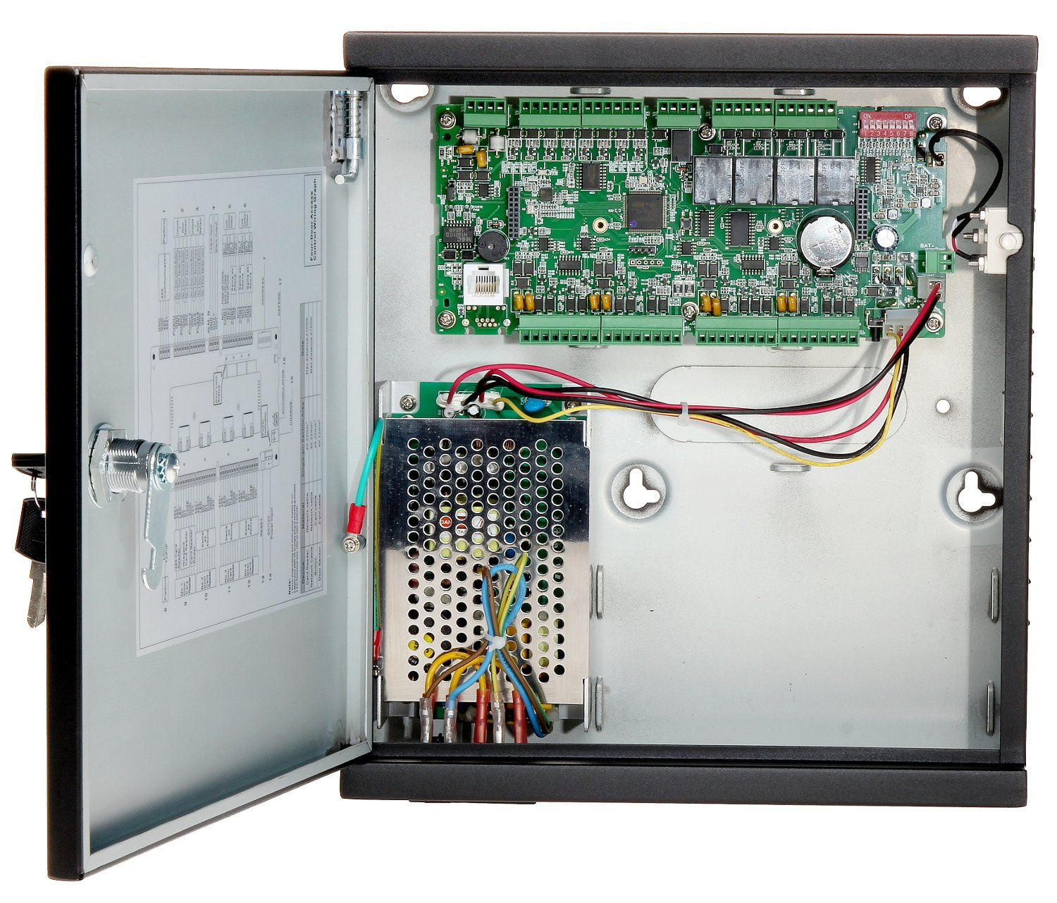 Контроллер на 4 двери (2-сторонний доступ); 100,000 карт и 150,000 записей; 8 считывателей (карты, пароли, отпечатки пальцев).