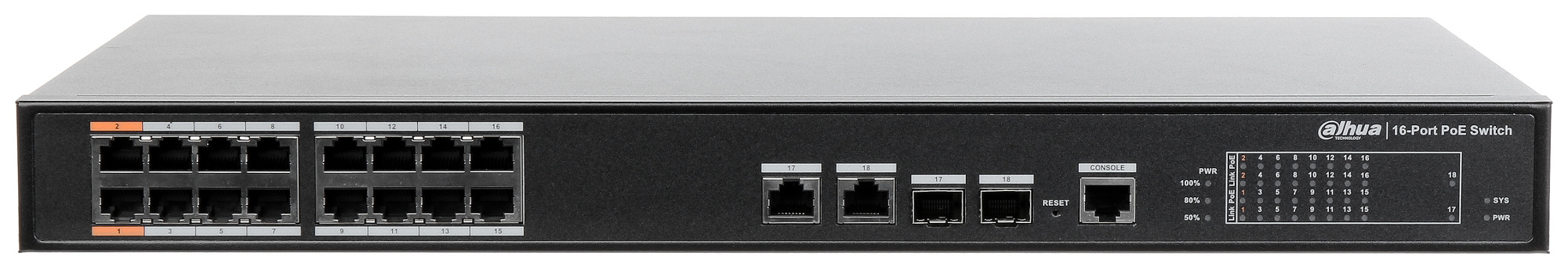 Dahua DH-PFS4218-16ET-190 - Управляемый коммутатор уровня L2+ оснащен гигабитными combo-портами (по 2 — BASE-T и Base-X) и 16 портами RJ-45 с поддержкой РоЕ (Fast Ethernet, Base-T), передающими данные и подающими питание на расстояние до 250 м.