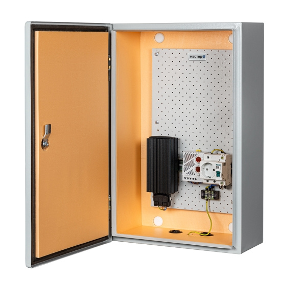 утеплитель из пенополистирола, замок 1 шт, ключ 1 шт, монтажная плата 1шт, гермовводы 2шт, розетка 1 шт, автоматический выключатель 1шт, гигростат NT 78-M (электронный) 1шт,нагреватель мощностью в 75 Вт 1шт.