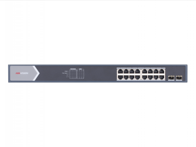 Hikvision DS-3E0520HP-E - Неуправляемый промышленный РоЕ-коммутатор оснащен гигабитными двенадцатью RJ-45 с поддержкой РоЕ, четырьмя RJ-45 с поддержкой Hi-PoE, двумя Uplink-портами RJ-45, двумя SFP-слотами для работы в волоконно-оптической сети.