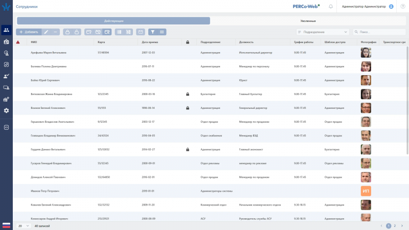 - Полный цикл управления учетными данными: Внесение, хранение и просмотр данных сотрудников и посетителей, включая фотографии, биометрические данные (отпечатки пальцев, лица) и информацию о транспортных средствах.