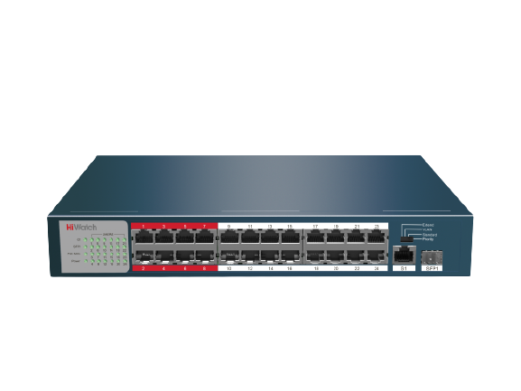 HiWatch DS-S2624P(B) - Неуправляемый PoE-коммутатор оснащен 24 FE PoE-портами RJ-45, SPF-портом для подключения к сети по оптоволоконному кабелю, FE-портом RJ-45 — по витой паре. Выделяет на один порт до 30 Вт при общем бюджете 230 Вт. Для портов 1 ~ 8 предусмотрено приоритетное распределение РоЕ, для портов 17 – 24 — режим передачи на дальнее расстояние.
