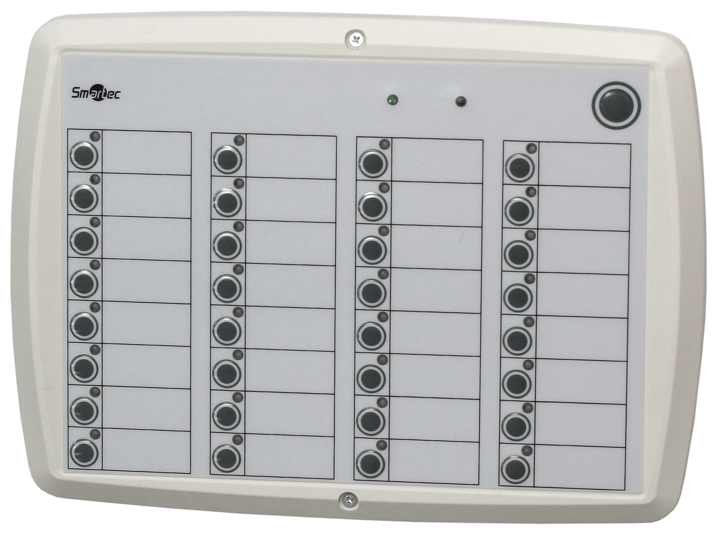Сетевая панель индикации и управления на 32 раздела, TCP/IP, Wiegand 26 и 34. ST-NC032 предназначена отображения статуса и управления различными элементами интегрированной системы безопасности, например, разделами охранной сигнализации. Она может использоваться совместно с контролерами ST-NC221 и ST-NC441. Устройство имеет 32 свободно программируемых элемента (световой индикатор/кнопка) и порт подключения считывателя для авторизации сотрудника при выполнении каких-либо операций.