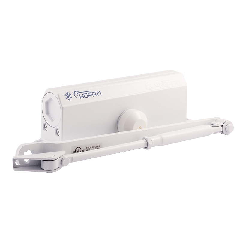 Универсальный дверной доводчик уличный морозостойкий, предназначен  для дверей левого и правого открывания. Устанавливается на тяжёлые входные двери весом от 80 до 120 кг. Данная модель разработана с учетом особенностей эксплуатации в российских условиях. Диапазон рабочих температур от –45° до +60°C. Прочный силуминовый корпус имеет высокие антикоррозийные свойства. Эти характеристики позволяют использовать модель 4S как доводчик на металлическую дверь. Скорость закрывания двери регулируется при установке в двух диапазонах при помощи винтов на корпусе доводчика.