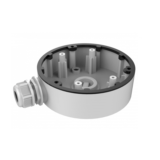 Монтажная коробка для купольных камер. Корпус из алюминиевого сплава, поверхность обработана напылением. Оснащена выходами на нижней и боковой сторонах. Подходит для установки в помещении и на улице.