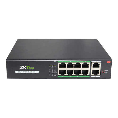 ZKTeco PE08-120 - POE коммутатор на 8 портов 10/100Mbps RJ-45, PoE, 2 порта 10/100Mbps RJ-45 Uplink, Стандарты  IEEE 802.3i, IEEE 802.3u and IEEE 802.3X, IEEE 802.3af and IEEE 803.3at . MDI/MDIX Self-adaptation, Max. 30Вт любой канал, до 120 Вт на все 8 кан., размеры 195 х 130 х 44 мм. AC 220В Дальность передачи данных и РоЕ до 250м