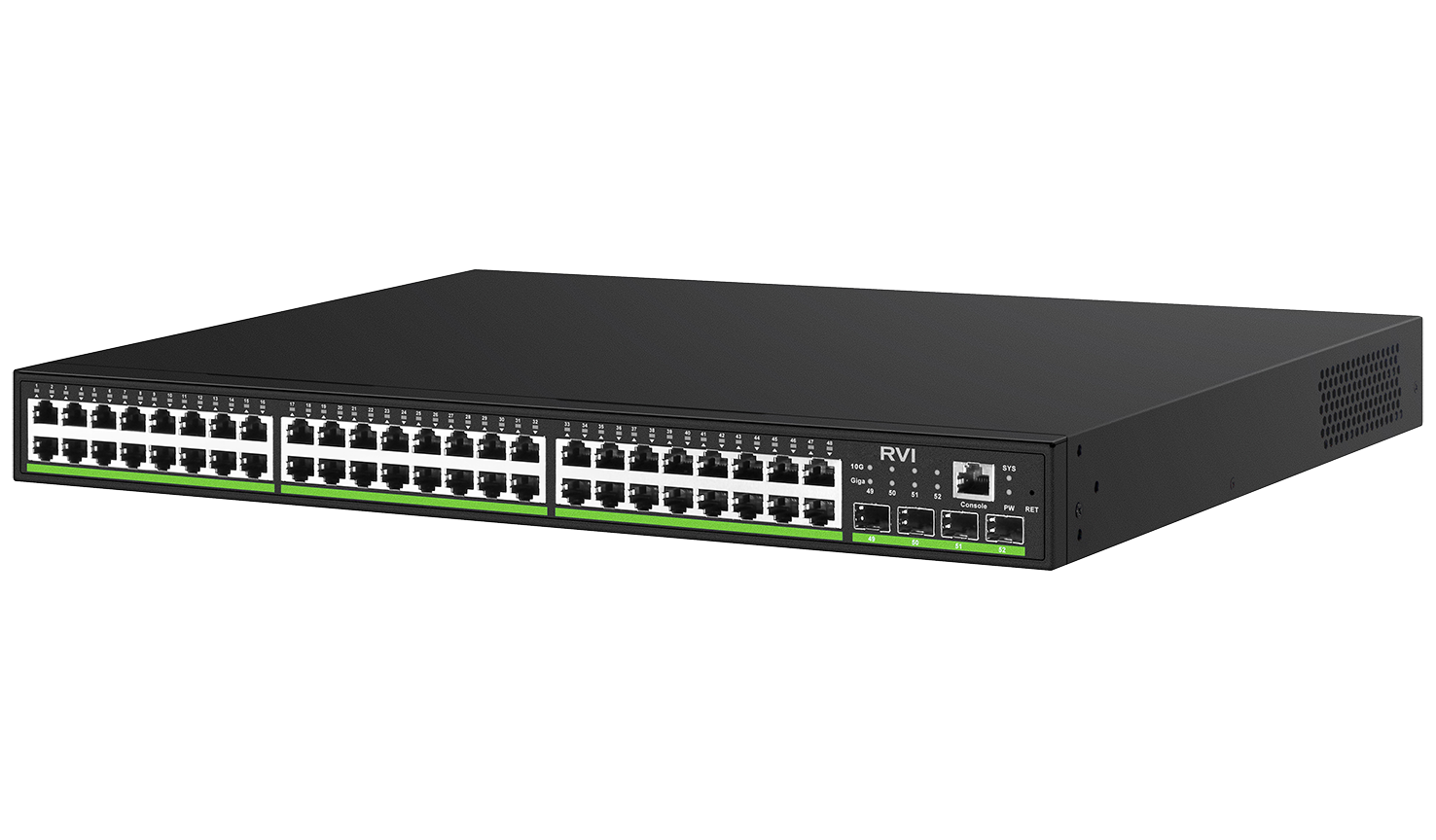 RVi-1NSM48G-4SP - Коммутатор оснащен 48 гигабитными PoE-портами и 4 независимыми 10 гигабитными SFP-портами.
