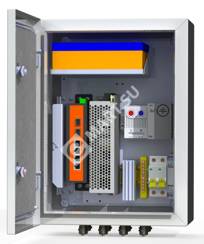 Двухполюсный защитный автомат 6А - 1 шт. Обогреватель 50Вт - 1 шт. Сдвоенный термостат - 1 шт. Блок бесперебойного питания 155Вт -1 шт. Аккумулятор 12В, 2,2А/ч - 4 шт. Промышленный неуправляемый коммутатор 4*PoE 802.3 af/at (бюджет 140 Вт), 2*SFP - 1 шт. Оптический кросс 4 порта SC/SM - 1 шт. Гермовводы 4*PG9, 4*PG13,5 -1 комплект.