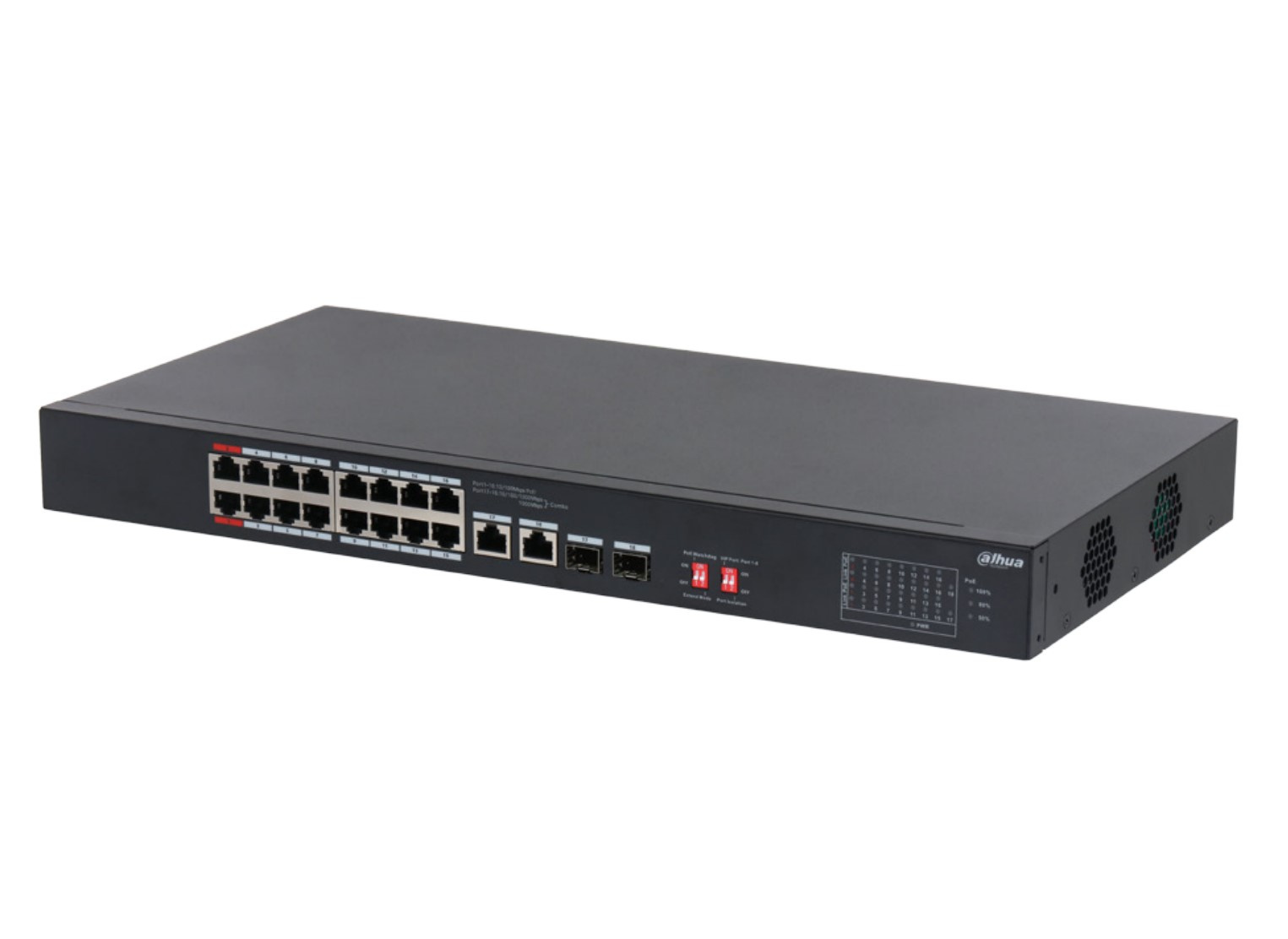 Порты: 16 RJ45 10/100 Мбит/с (PoE/PoE+/Hi-PoE), 2 комбинированных SFP/RJ45 10/100/1000 Мбит/с (uplink)