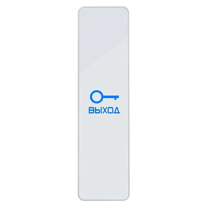 Кнопка выхода накладная сенсорная, пластиковая белого цвета, ультра тонкий корпус. Подсветка. Коммутируемый ток - 3А. Питание 12-24В DC. Контакты: НО и НЗ. Температура эксплуатации: -20..+55С. Габаритные размеры: 150х40х12 мм.