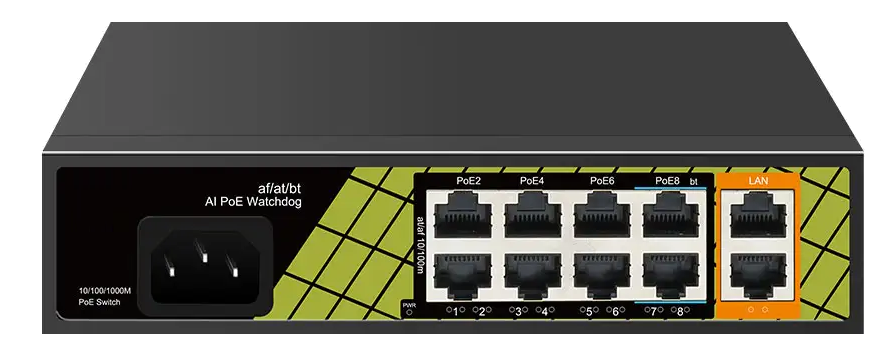 PoE коммутатор 8x100 Мбит/с PoE портов (6 портов 802.3af/at, максимальная мощность PoE 30Вт на порт, 2 порта 802.3af/at/bt, максимальная мощность PoE 60Вт на порт) + 2x1000 Мбит/с порта Uplink, общий бюджет PoE 120 Вт, автоматический PoE watchdog, встроенный блок питания, грозозащита и защита от статического электричества, от -30°С до +60°С.