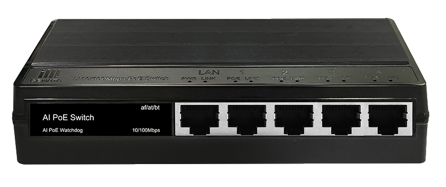 PoE коммутатор 4x100 Мбит/с PoE портов (3 порта 802.3af/at, максимальная мощность PoE 30Вт на порт, 1 порт 802.3af/at/bt, максимальная мощность PoE 60Вт на порт) + 100 Мбит/с порт Uplink, общий бюджет PoE 60 Вт, автоматический PoE watchdog, встроенный блок питания, грозозащита и защита от статического электричества, от -30°С до +60°С.