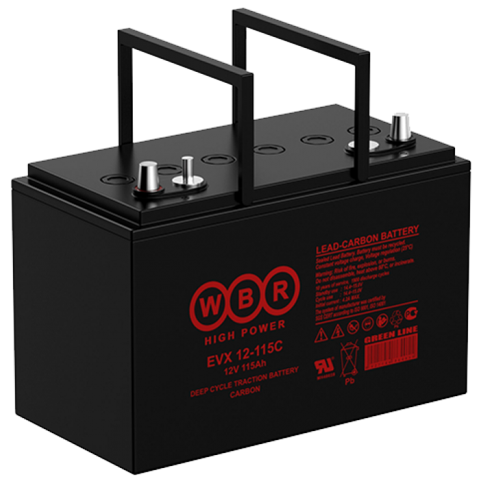 Аккумулятор WBR EVX12-115C2 - герметизированная, выполненная по технологии AGM, карбоновая свинцово-кислотная аккумуляторная батарея. Обладает высоким качеством и надежностью, устойчивы к глубоким разрядам и применяются для питания электрических транспортных средств, гольфкаров, газонокосилок, полотерных и поломоечных машин, медицинских колясок и другой техники.