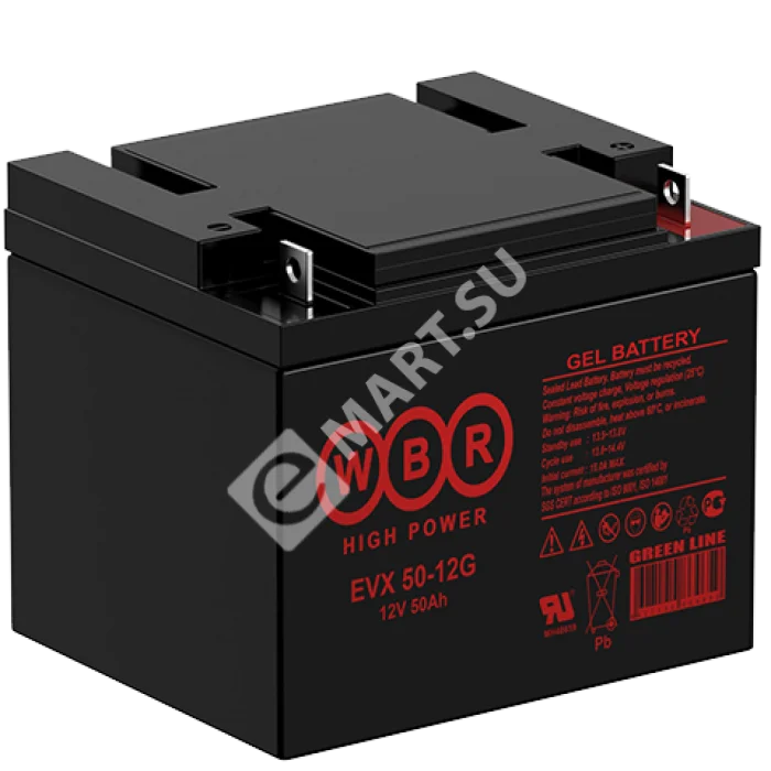 Аккумулятор WBR EVX50-12G - герметизированная, выполненная по гелевой (GEL) технологии, тяговая свинцово-кислотная аккумуляторная батарея. Обладает высоким качеством и надежностью, устойчива к глубоким разрядам и применяется для питания электрических транспортных средств, гольфкаров, газонокосилок, полотерных и поломоечных машин, медицинских колясок, электроинструмента, электронасосов, эхолотов, осветительных приборов, в том числе наружного освещения и другой техники.