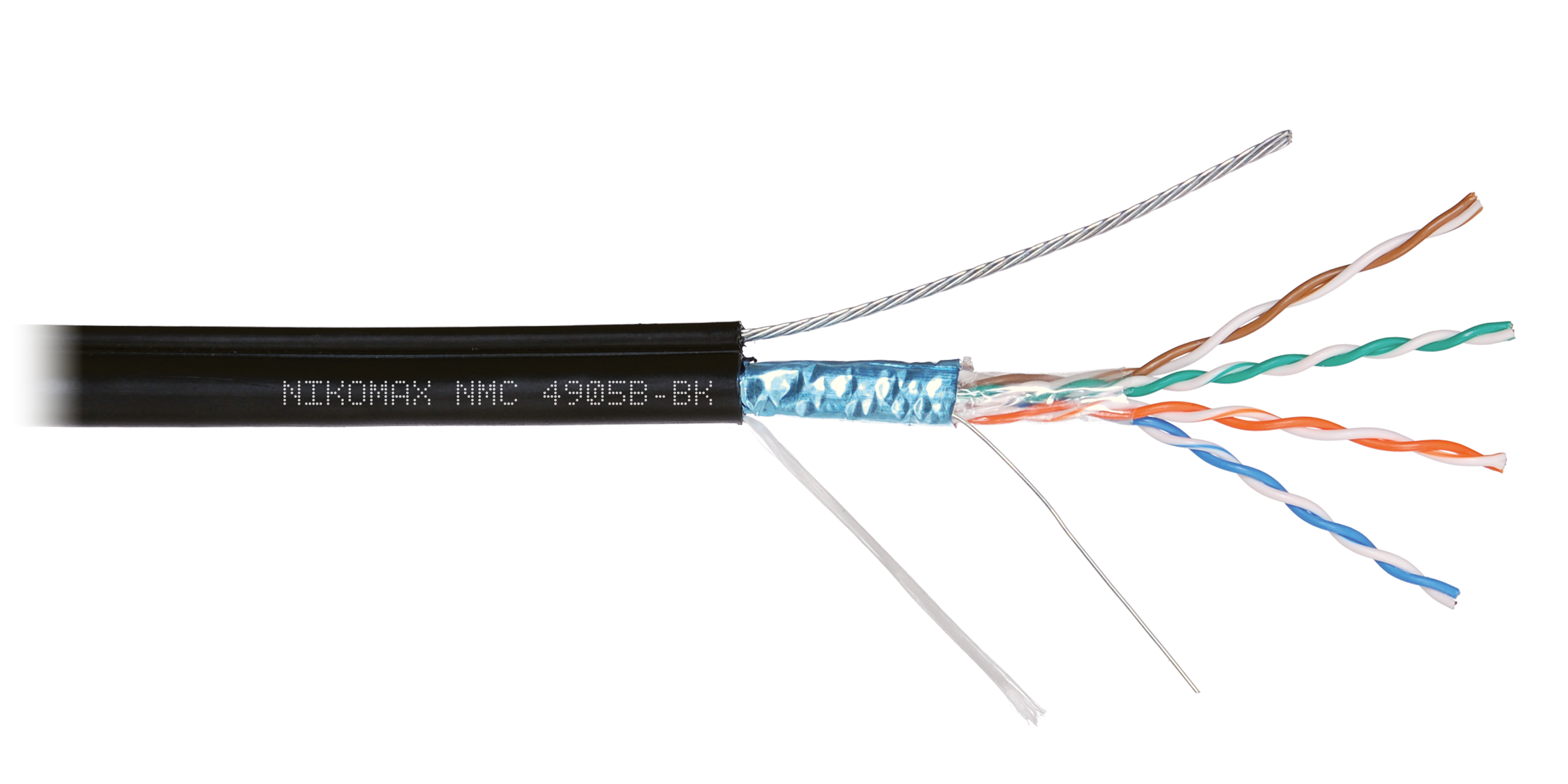 Кабель NIKOMAX F/UTP 4 пары, Кат.5e (Класс D), тест по ISO/IEC, 100МГц, одножильный, BC (чистая медь), 24AWG (0,51мм), полиэтилен, внешний, с многожильным тросом (1,25мм), черный, 500м - гарантия: 3 года