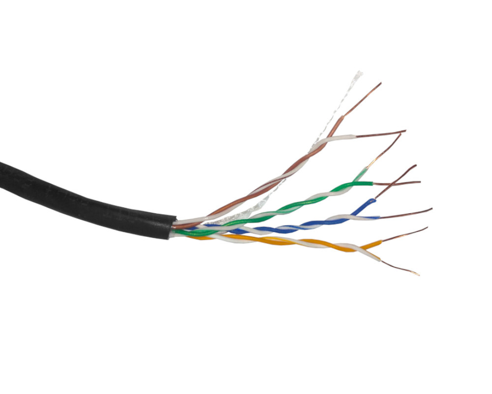 Кабель витая пара UTP 4 наружный (уличный, outdoor) применяется в системах СКС для внешней прокладки. Предназначены для использования в высокоскоростных системах передачи данных со скоростью до 1Гбит/с. Кабель соответствует стандартам ANSI\TIA\EIA-568-B.2 Проходит Fluke тест Огнестойкость: UL VW-1, IEC-332.1 Арамидная нить позволяет легко удалять оболочку кабеля на необходимую длину. Технические характеристики: Проводник, d: медь (Cu), 24AWG, одножильный Внешний d кабеля: 5,6 мм± 0,2мм Тип и цвет оболочки кабеля: ПЭ черный Применение: для наружных работ Бухта: 305 м Проходит Fluke тест на 100 метрах Относительная скорость распространения сигнала (NVP): 72% Диапазон частот: 1-100 МГц Волновое сопротивление, Ом: 100 + -15 Дисбаланс сопротивления 5% Диапазон температур °С: Хранение: от -40 до +60 Прокладка: от 0 до +60 (при этом до начала прокладки кабель должен находиться в помещ